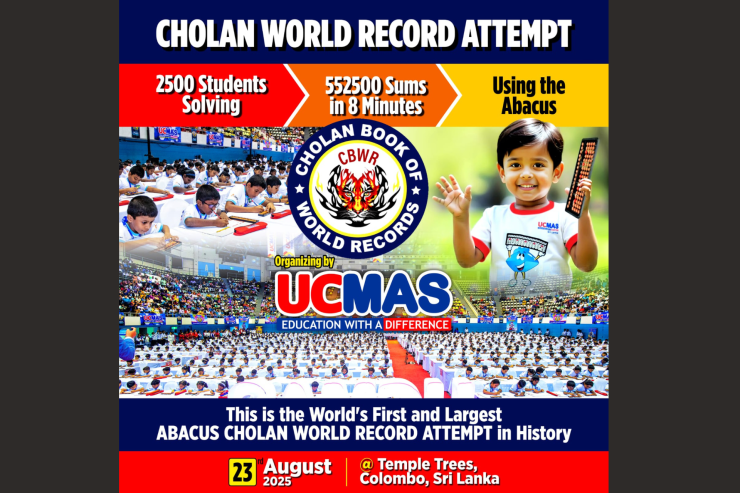On 23rd August 2025, UCMAS is organizing the World’s First and Largest Abacus Cholan World Record Attempt at Temple Trees, Colombo, Sri Lanka. In this remarkable event, 2500 students will attempt to solve an incredible 552,500 sums in just 8 minutes using the abacus. This grand effort, recognized by the Cholan Book of World Records (CBWR), highlights the power of focus, mental math, and teamwork. It stands as a milestone in education, showcasing young learners’ extraordinary skills and setting an inspiring example for future generations.